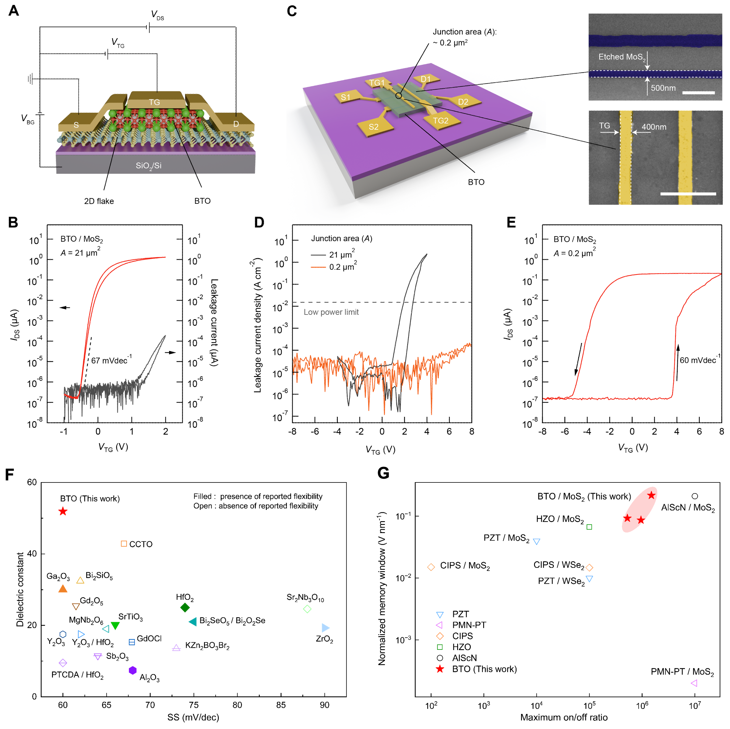 图2 顶栅BTO/MoS2晶体管的漏电流抑制与器件性能。(A) 以自支撑 BTO 作为顶栅介质的双栅二维晶体管结构示意图; (B) 大结面积器件的转移特性与漏电曲线,显示严重漏电流; (C) 缺陷容忍设计示意图:通过微缩结面积抑制器件漏电; (D) 不同结面积器件的漏电流密度对比,微缩设计显著抑制漏电; (E) 优化后器件的转移特性,展现优异的铁电回滞与开关性能。(F-G) 本工作BTO/MoS2晶体管与现有高 k顶栅 MoS₂ 晶体管(G)和二维铁电晶体管(H)的性能对比。