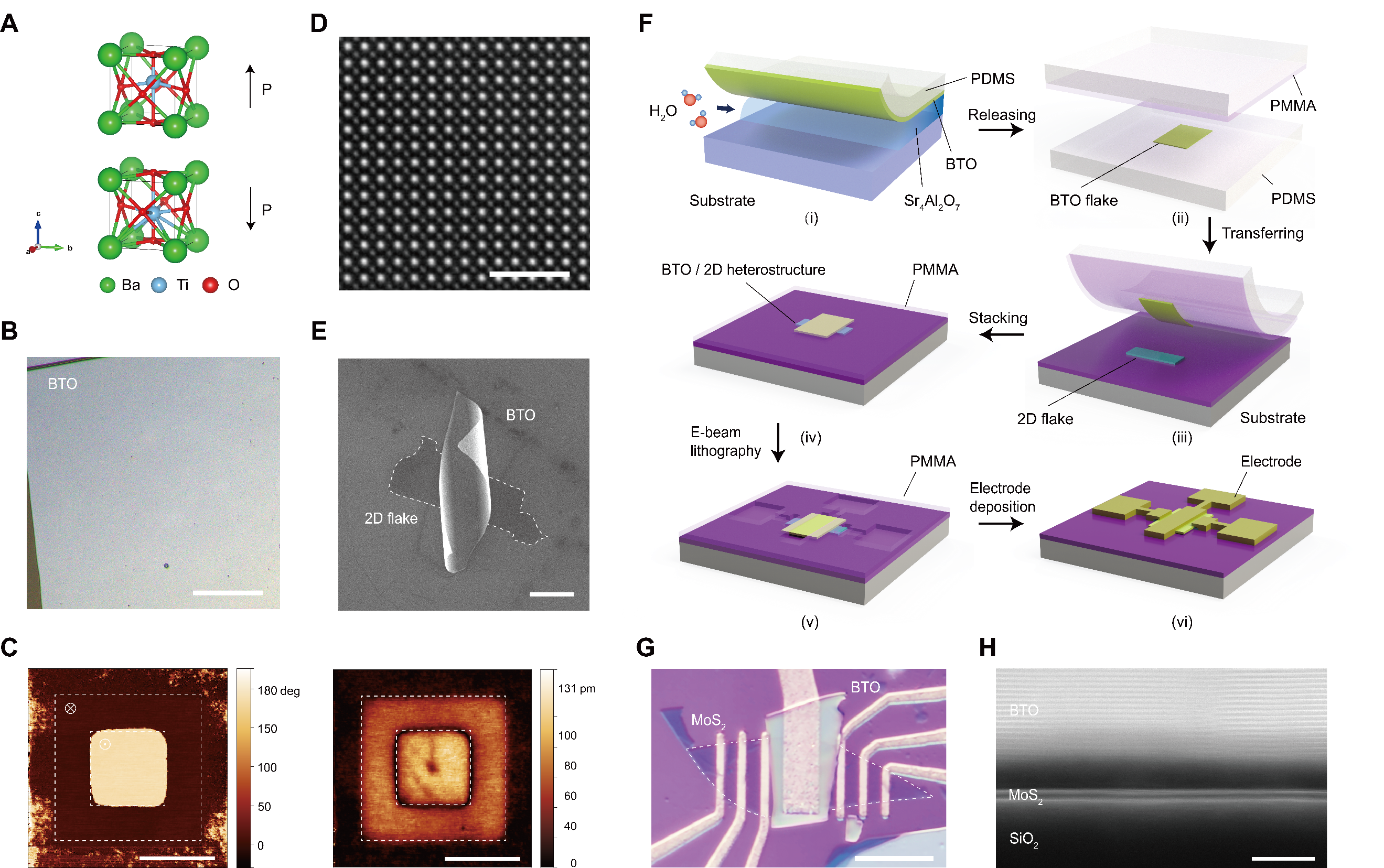 图1 BTO铁电薄膜与二维材料的范德华集成。(A) 钙钛矿 BaTiO3晶体结构与极化状态示意图; (B) 剥离后的大面积自支撑 BTO 薄膜光学图像; (C) PFM验证薄膜的铁电翻转特性; (D) 自支撑 BTO 薄膜的平面 STEM 图像,展示了高质量晶格结构; (E)传统转移中发生卷曲形变的 BTO 薄膜; (F) PMMA 辅助的抗卷曲范德华集成工艺流程示意图; (G) 制备的 BTO/MoS2顶栅晶体管光学图像; (H) 器件沟道区域的截面 STEM 图像,显示均匀的范德华界面。