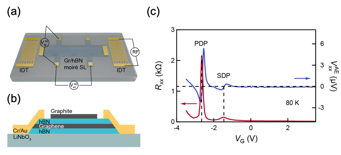 图1: (a)石墨烯-氮化硼莫尔超晶格器件声电测量示意图。(b)器件结构截面示意图。(c)石墨烯-氮化硼莫尔超晶格器件的电输运和声电表征。