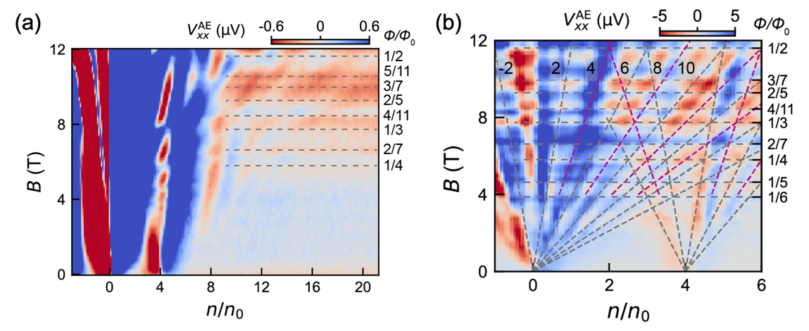 借助这一技术,研究团队在80 K的相对高温下,成功观测到了清晰的高达五阶的分数Brown-Zak振荡。在3.5 K的低温下,首次通过声电输运方法直接表征了Hofstadter Butterfly能谱的完整分形结构。该图谱不仅揭示了不同简分数磁通量子比例下形成的高阶磁布洛赫态,还观测到了因电子相互作用导致的对称性破缺朗道能级。这些精细特征在传统的电导率测量图谱中几乎无法辨认,充分证明了声电输运技术在探测复杂量子态方面的高灵敏度优势。