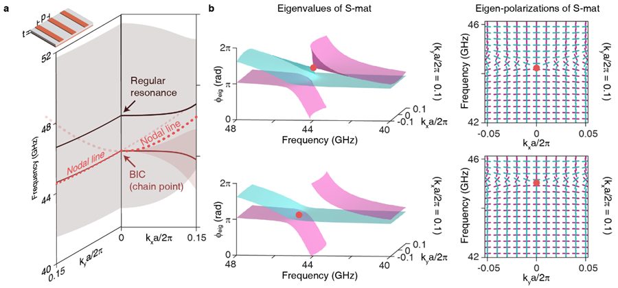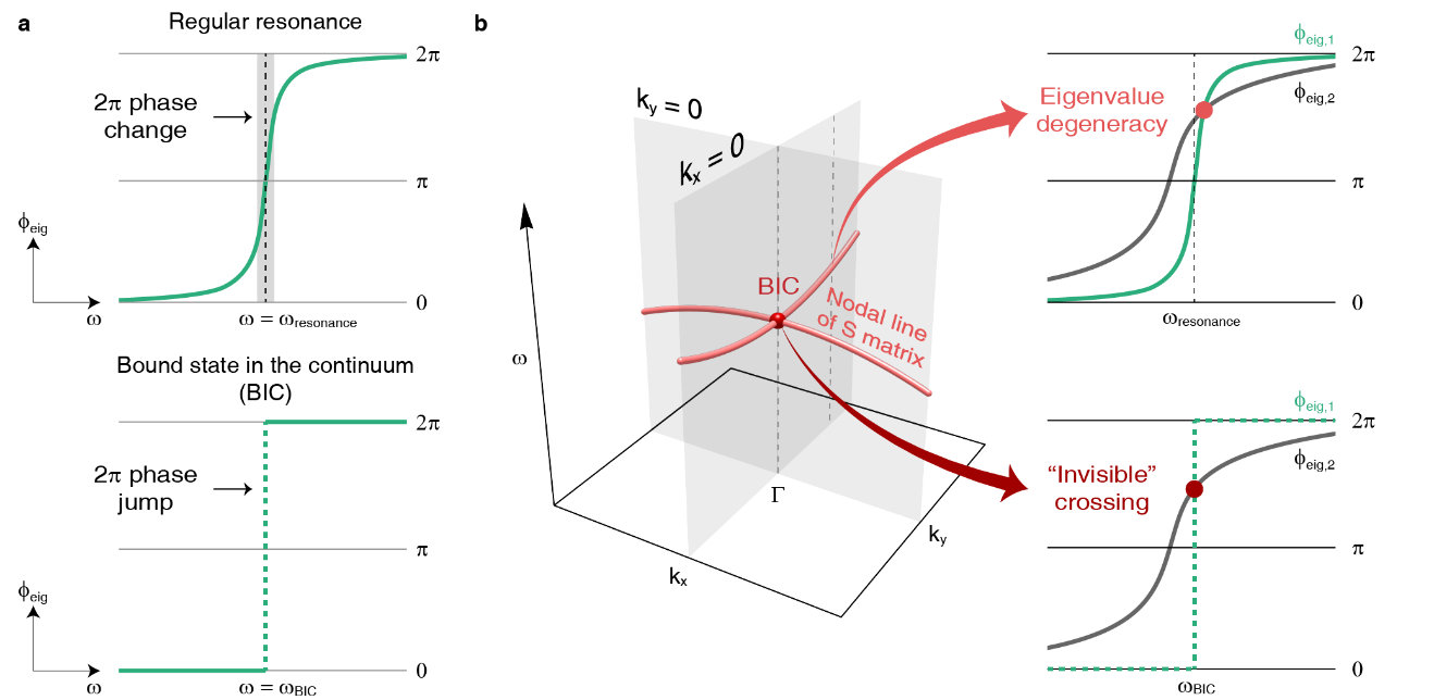 图1 BICs与散射矩阵节线链的拓扑联系:(a)普通共振呈现平滑2π本征散射相位变化,而BIC在其频率处产生突然的2π本征散射相位跳变;(b)该跳变使BIC成为节线链的“钉扎点”,两条节线在BIC处相交。