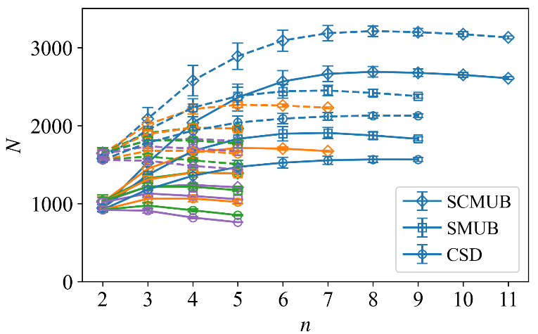 图1. 非敌对(实线)与敌对(虚线)场景中验证体哈尔随机纯态所需平均测试数目。蓝色、橘色、绿色和紫色分别对应局域维度。